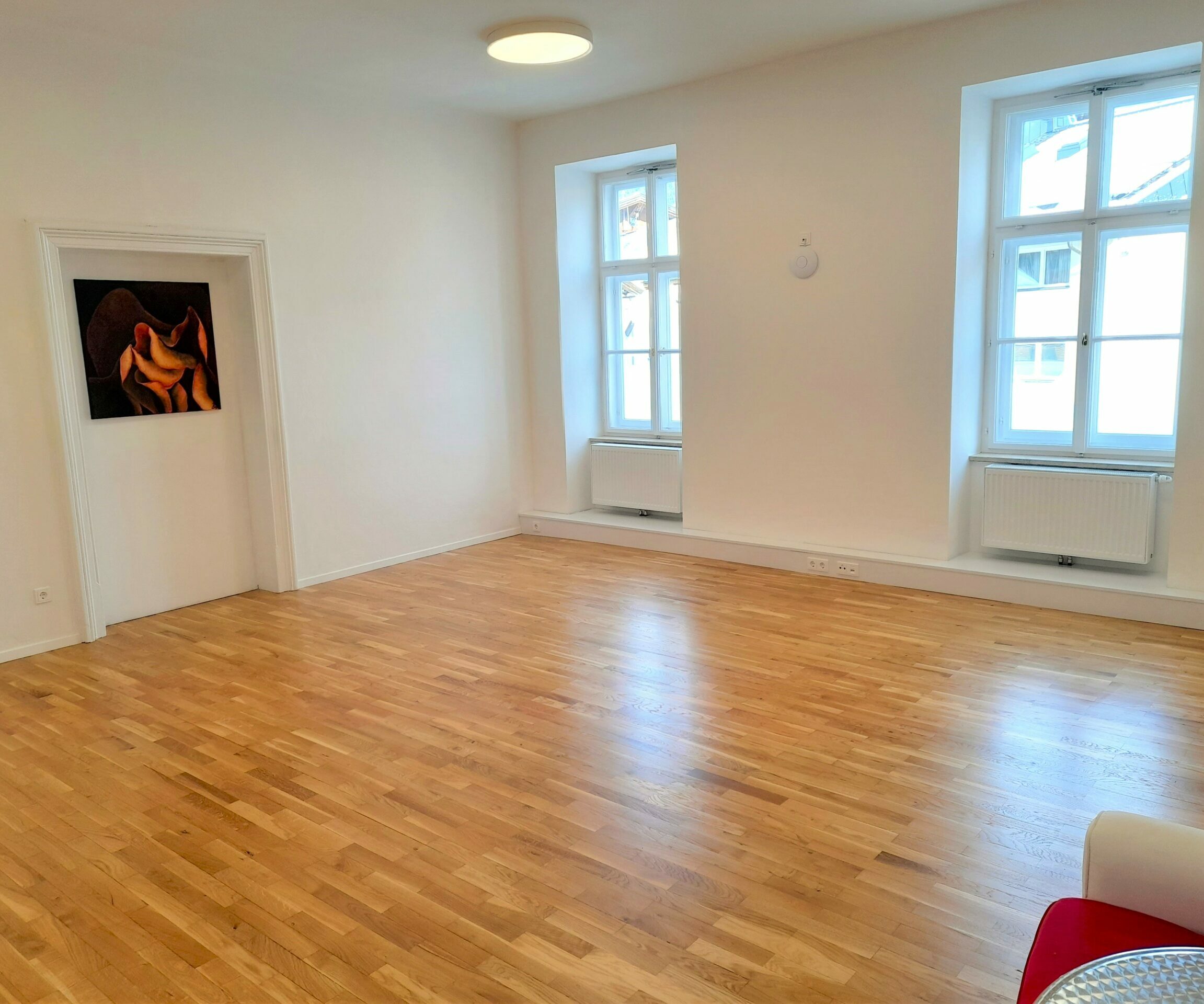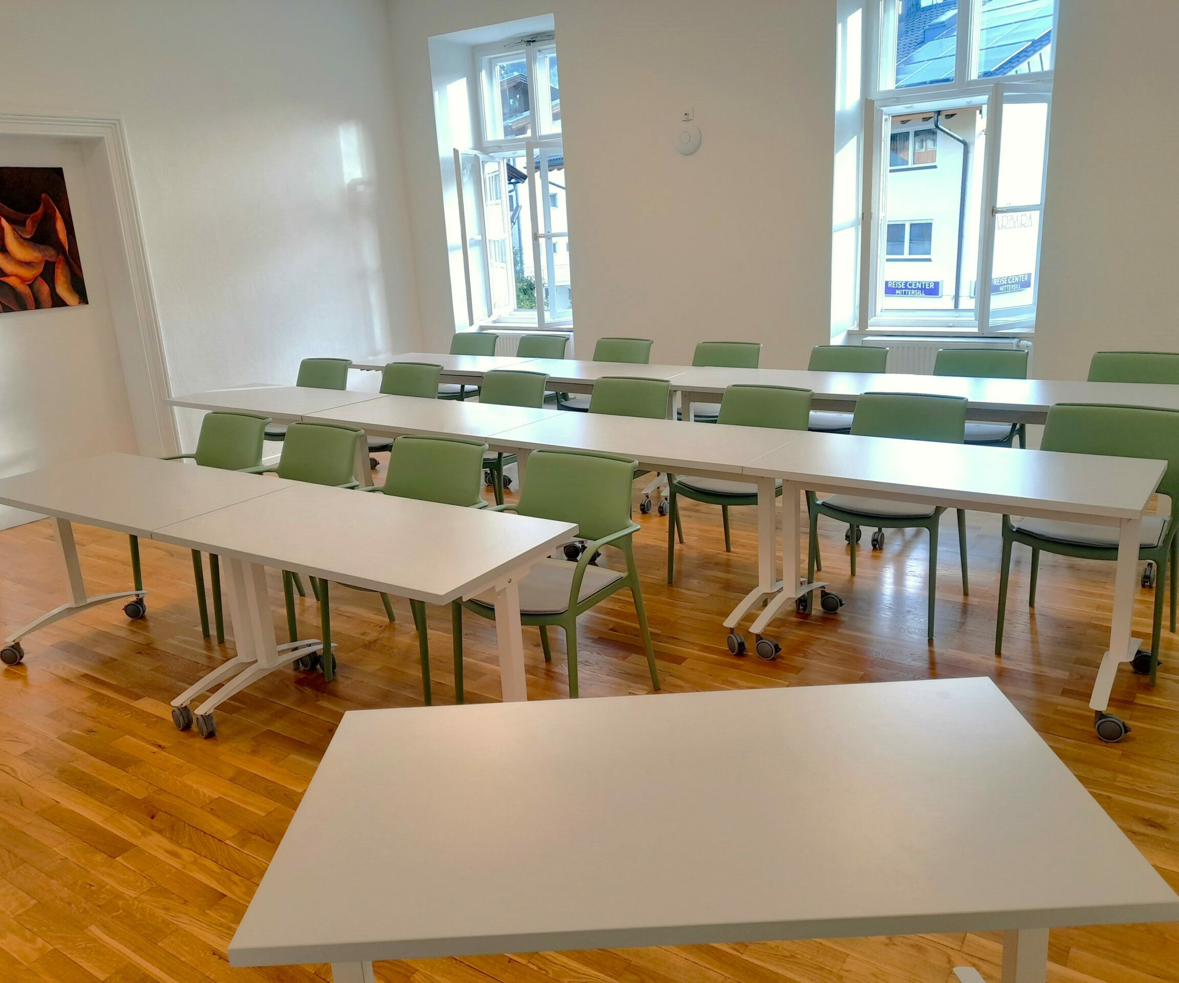 Der Raum kann sowohl für Seminare und Workshops oder für Yoga- und Gymnastikkurse gemietet werden. Er ist durch eine Flügeltür abtrennbar und somit auch einzeln zu mieten.